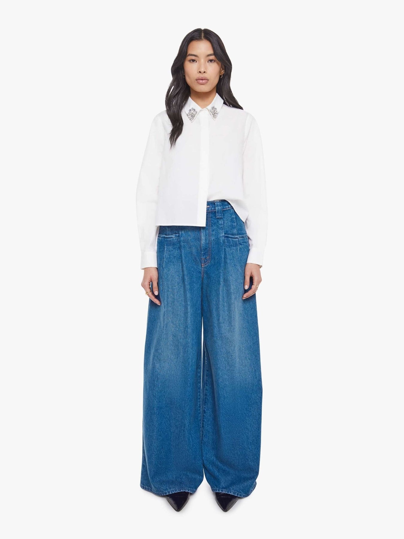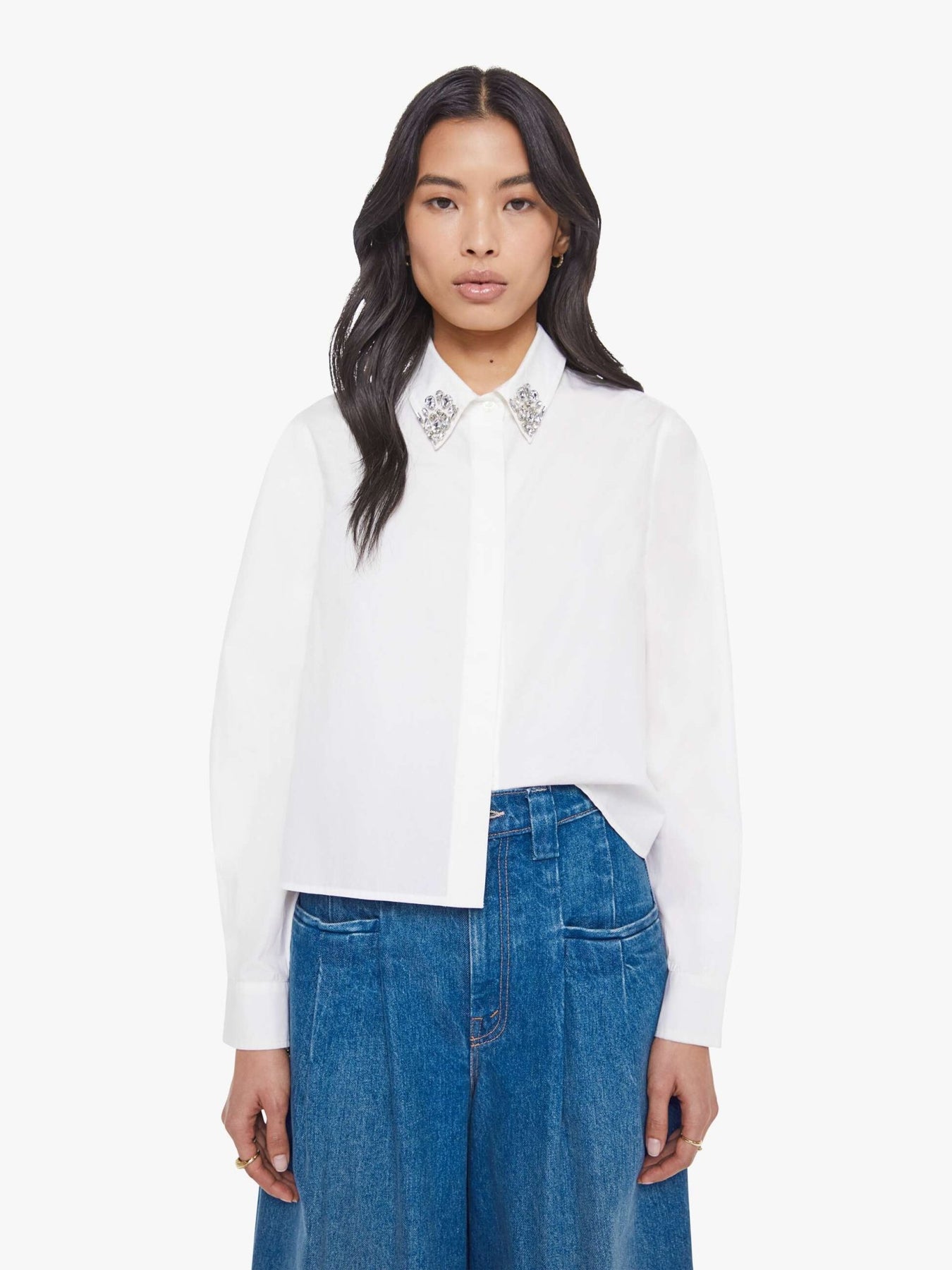 A twist on the classic button-up with long sleeves, a hidden button panel and a cropped fit. The Honor is made from 100% cotton in white with an embellished collar.