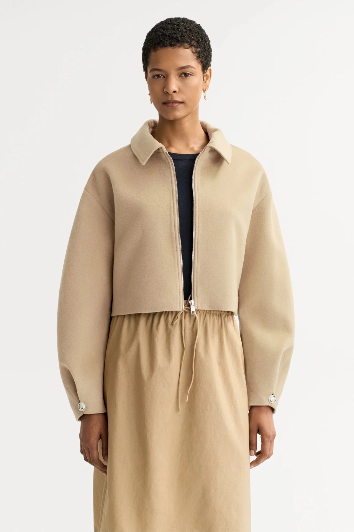Cropped zip jacket with button detailing in wool and silk blend.Details- Woven- Cropped fit- 80% Wool, 20%SilkModel is wearing size S and is 180 cm tall.