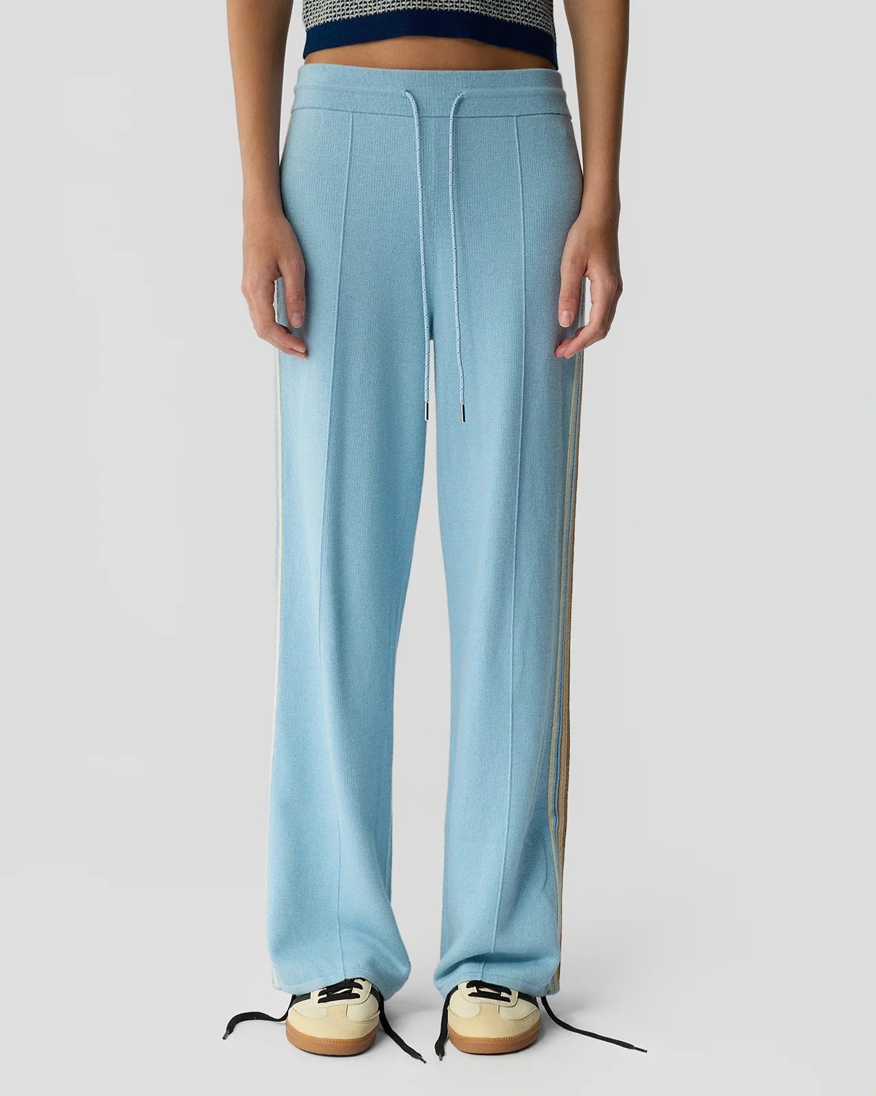 The Track Pant is a women’s light-weight cotton–cashmere straight-leg track pant featuring a ribbed drawstring waistband, and sporty stripe detailing. Designed for comfort and versatility, these knit pants transition effortlessly from lounging at home to running errands, travel days, and life on the move.