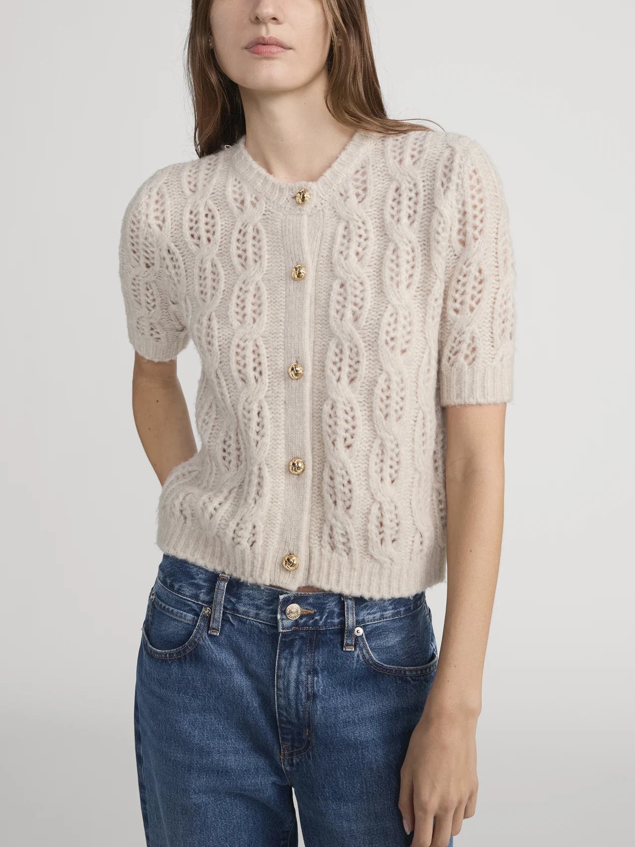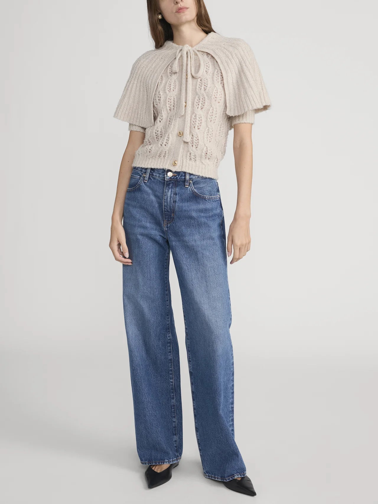 The Cape Cardi is crafted from a luxurious blend of extrafine merino wool and yak, featuring a short-sleeve pointelle knit with gold buttons and a removable cape for a softly structured, feminine silhouette.