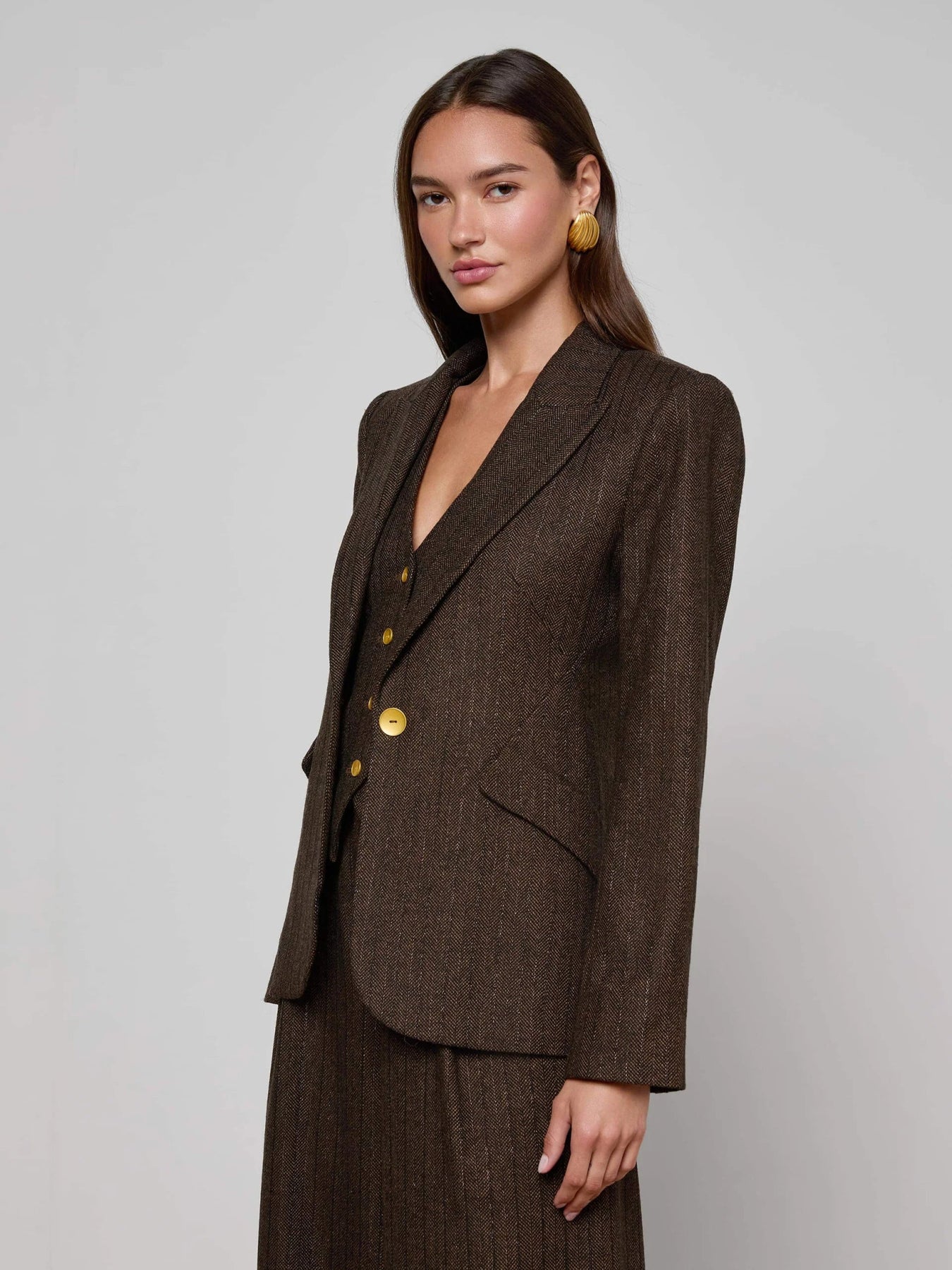 The Chamberlain Blazer is back, this time in a luxurious Italian herringbone with a subtle lurex pinstripe. Expertly tailored in a recycled wool-blend with structured shoulders and a flattering, nipped-in waist, this essential is finished with a single gold-tone button. It pairs effortlessly with denim, trousers, or over a slip dress for a polished day-to-night look.