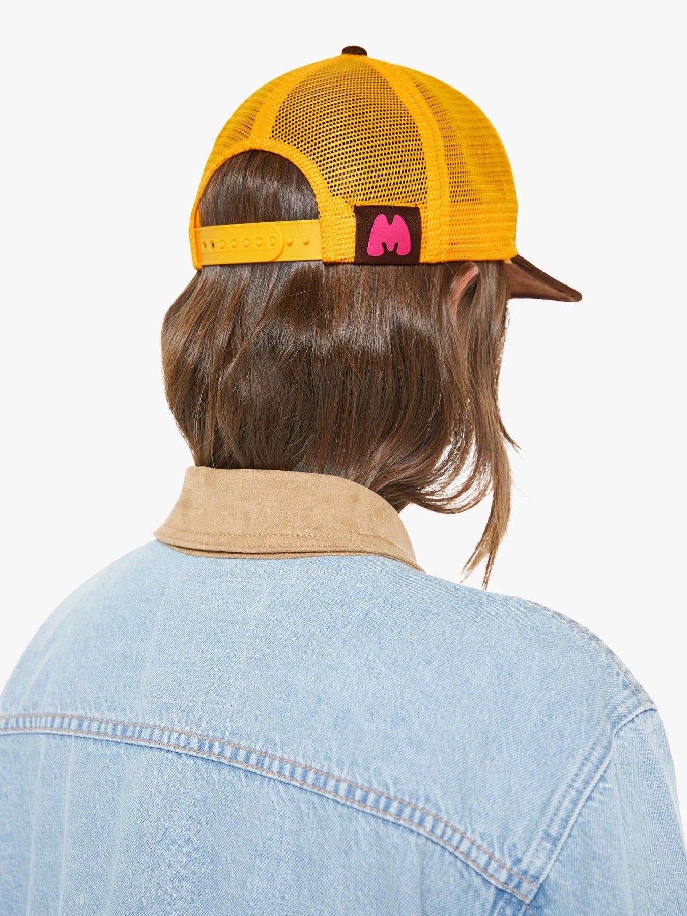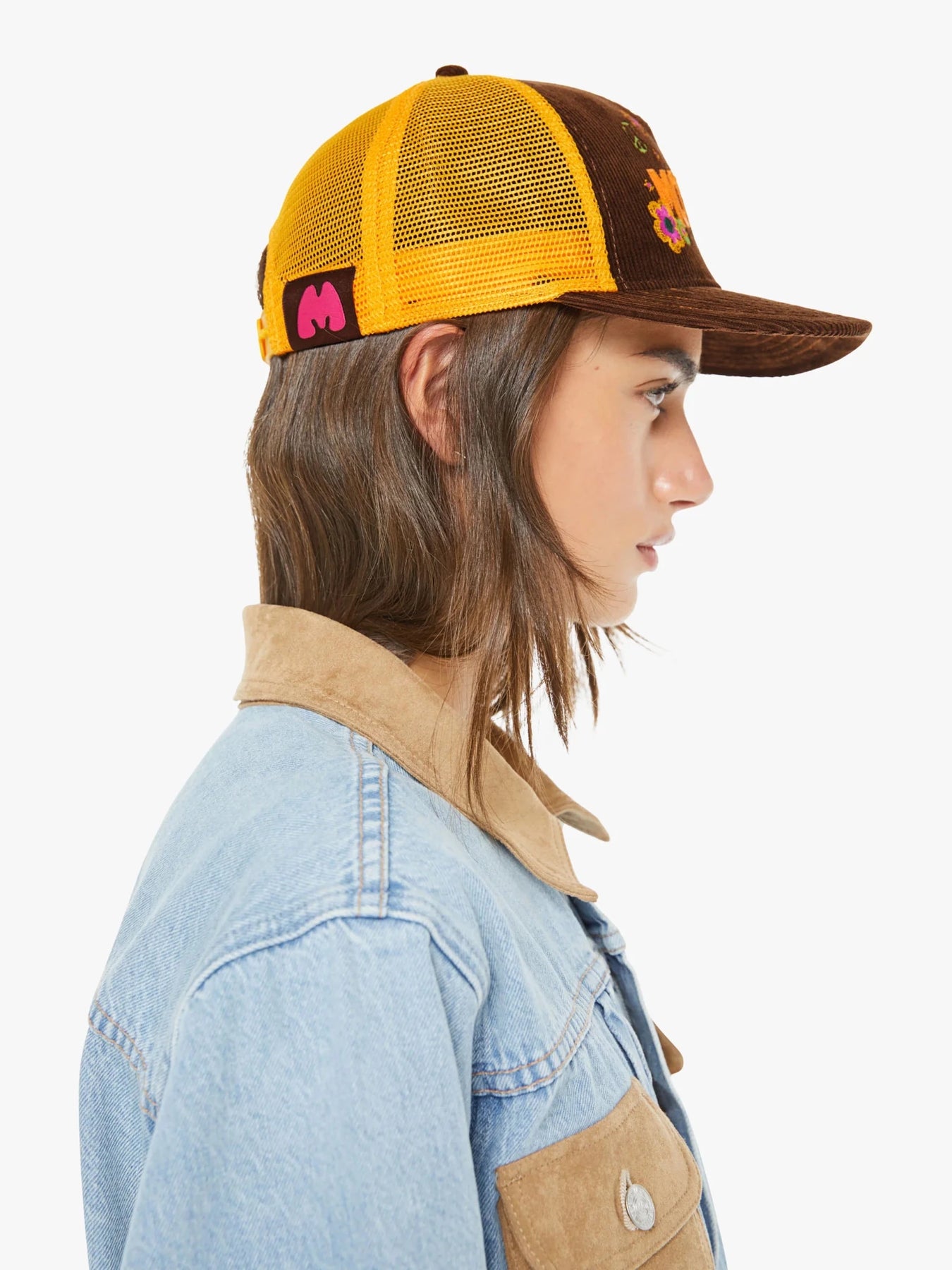 Jump for joy. A vintage-inspired trucker hat designed in brown corduroy and golden yellow mesh with MOTHER's name and colorful embroidery on the front.
