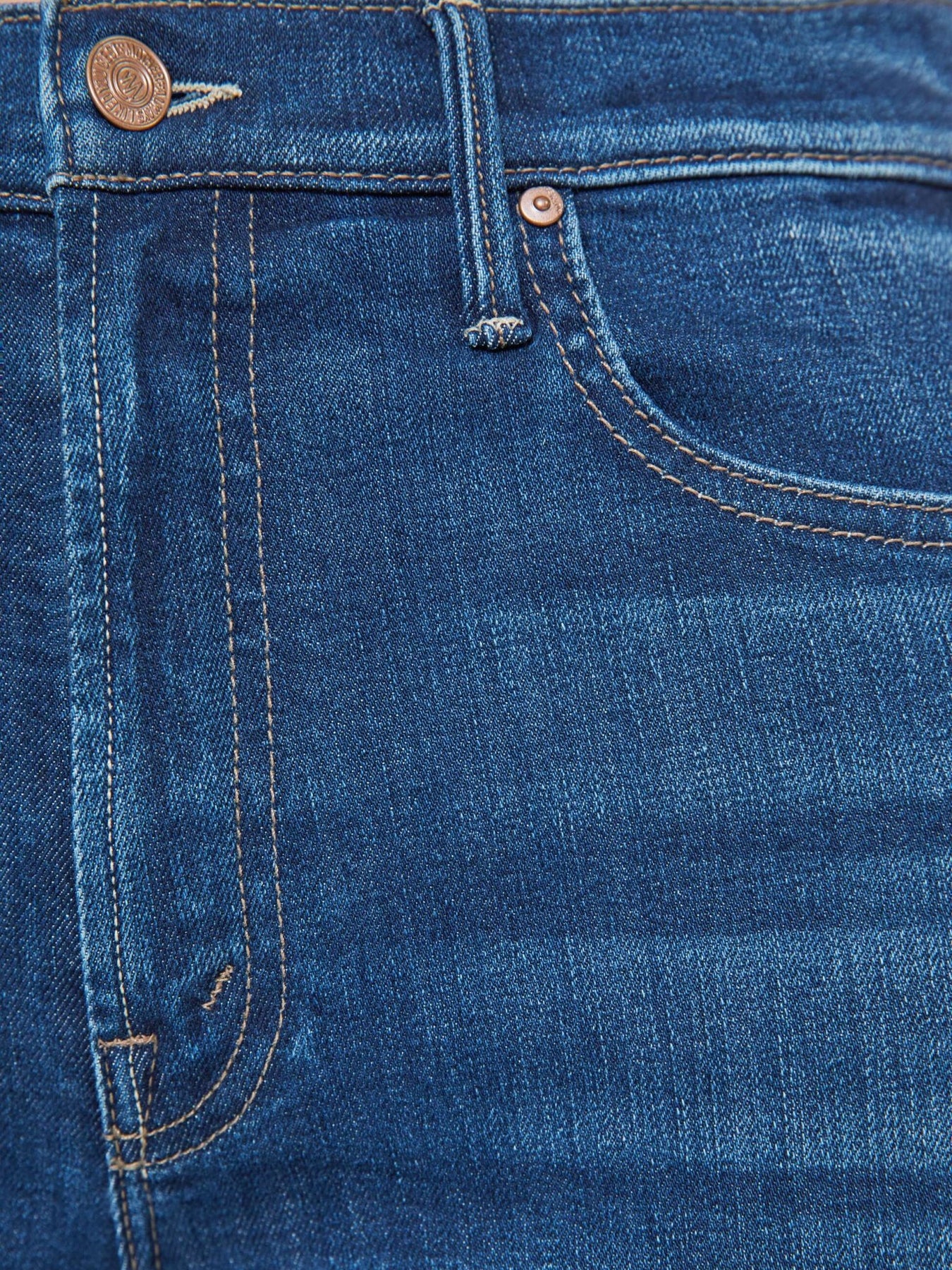Up to no good. A high-rise straight-leg jean with a zip fly, 32-inch inseam and a clean hem. Made from a blend of recycled stretch denim, Troublemaker is a mid-blue with whiskering and fading at the knees.
