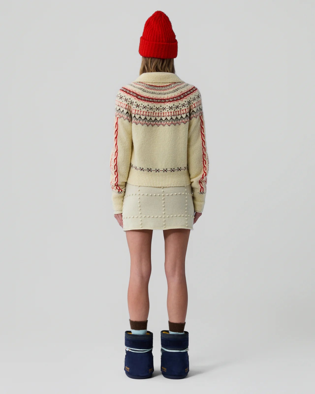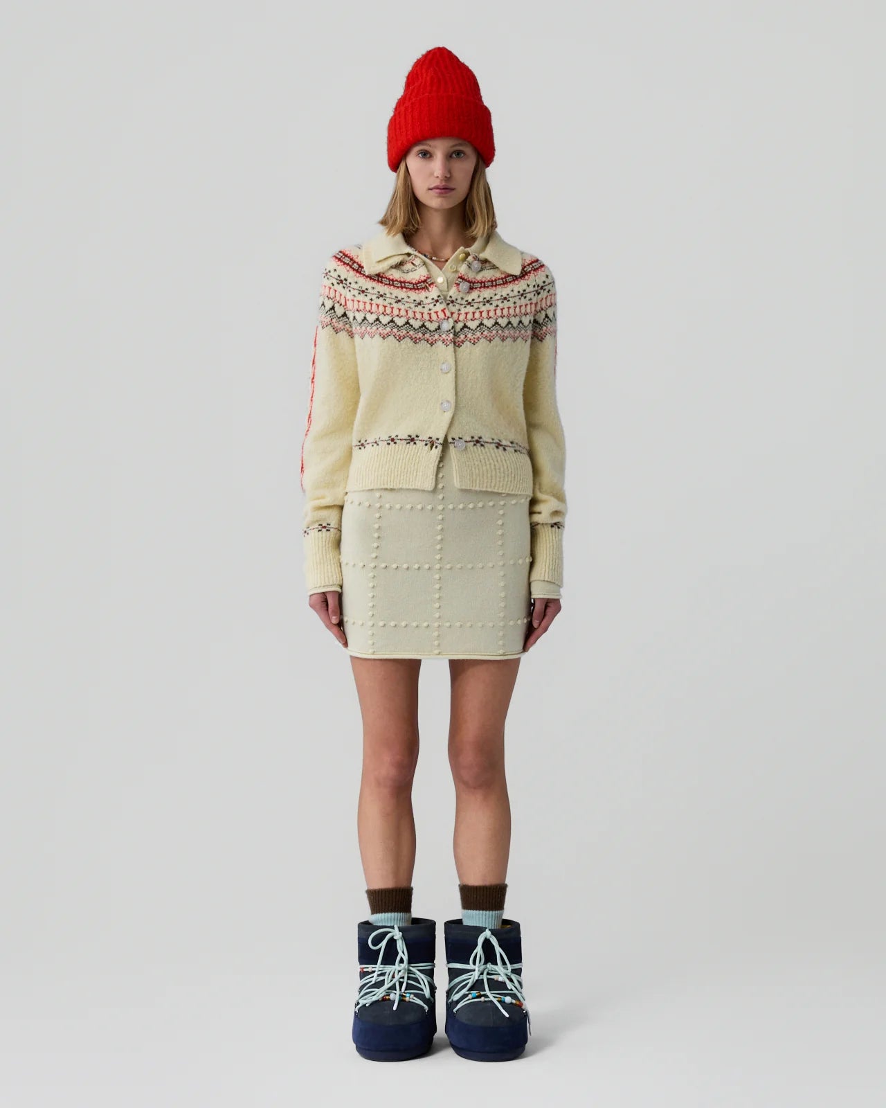 The Guest in Residence Cloud Chalet Cardigan is a women’s Fair Isle cashmere cardigan crafted from a wool–cashmere blend and plush Cloud yarn. Designed with a relaxed, shrunken fit, it offers cozy warmth and timeless pattern — perfect for layering through the colder months.