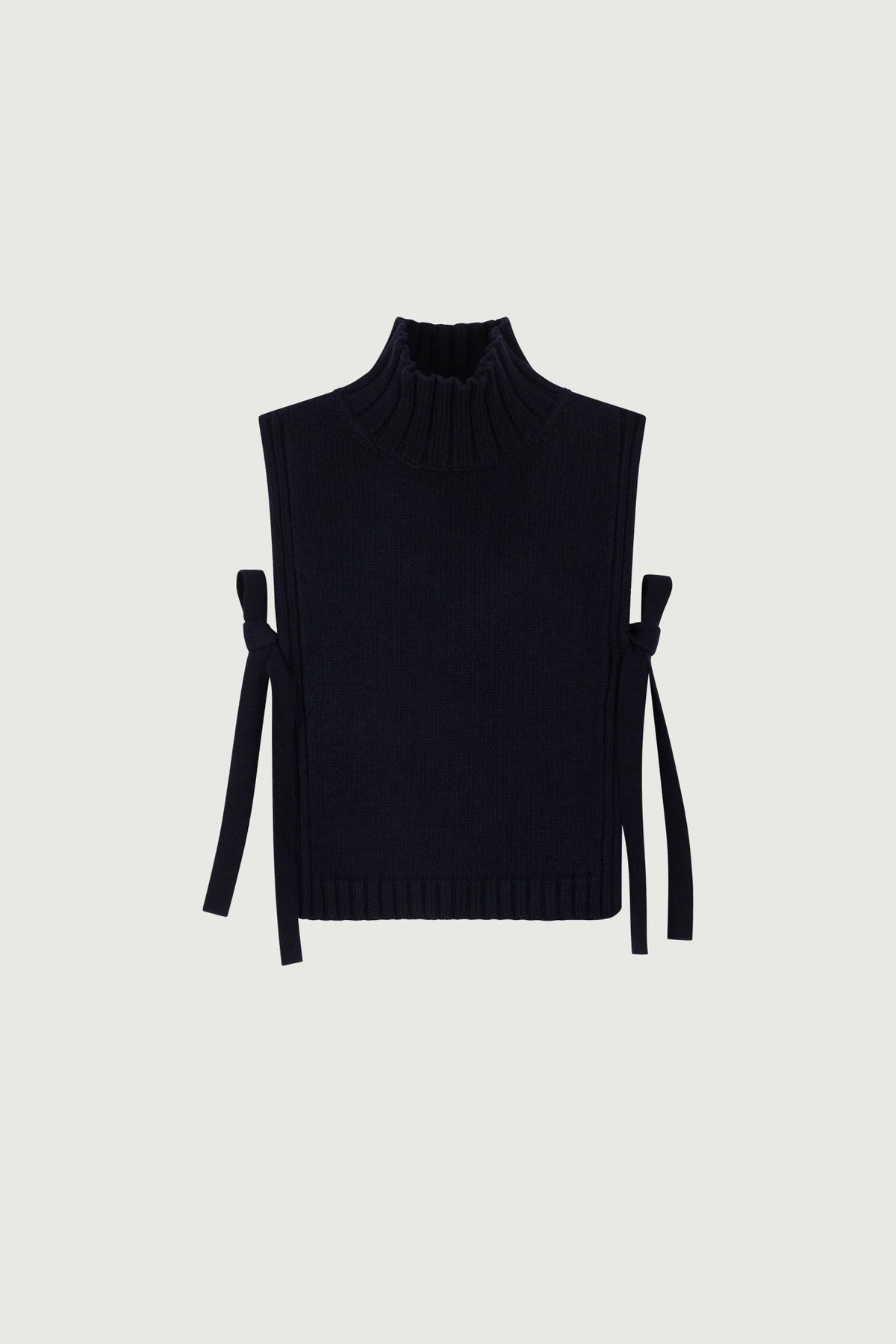 OR is a woolen bib, adjustable with two side ties to tie or leave hanging. The compact knit provides structure and a high, upright collar. It adds a stylish touch to an outfit. Conveniently, it allows freedom of arm movement when worn under a jacket or coat.