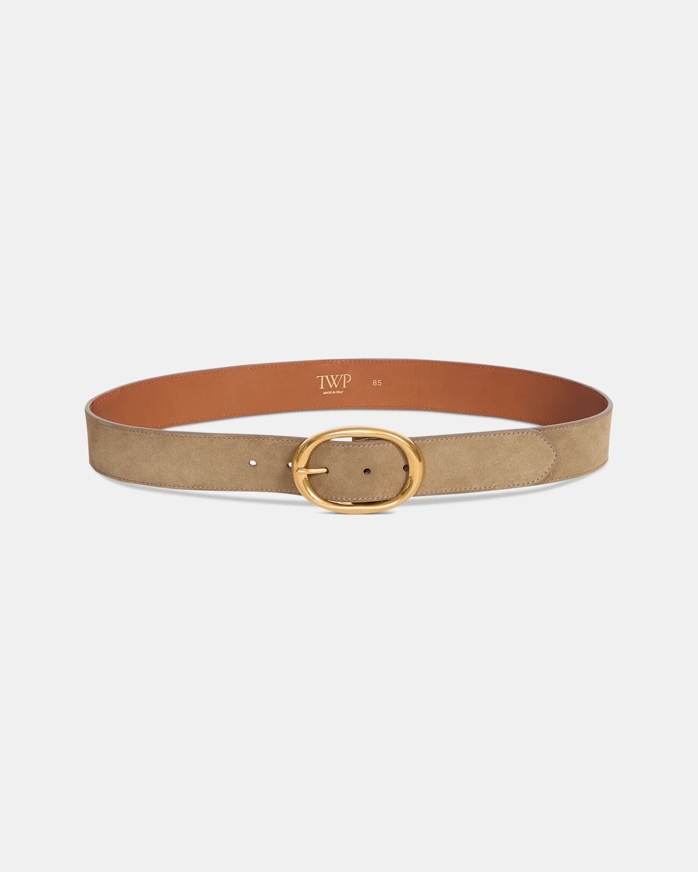 Wide belt in luxe Spanish cowhide leather and suede that burnishes and softens over time. The Wide belt has a strap that will contour to the natural shape of your body with use. Accented with a custom molded brass buckle, coated with an antique gold finish. Made in Italy.